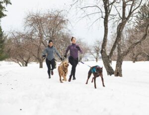 Essentially running with your dog, but with a proper harness and hands-free waist belt. It’s a great winter option if the paths are packed and not too icy. For older pets, think of it as a light jog or brisk walk where they set the speed.